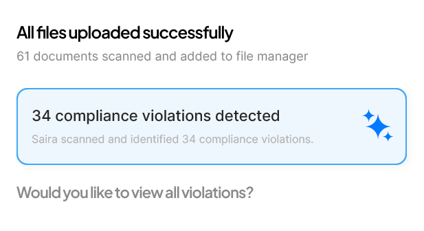 Stop manual checks and eliminate human error. Saira AI scans, identifies, and monitors every document for violations—automatically.